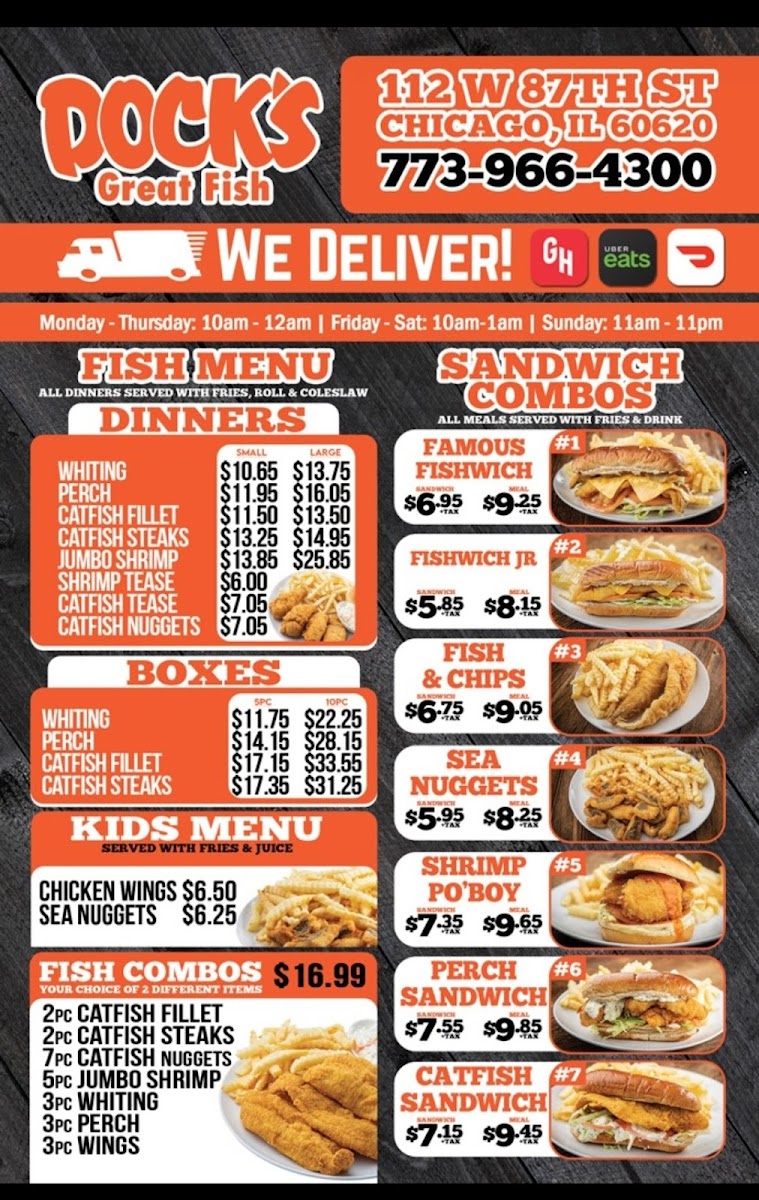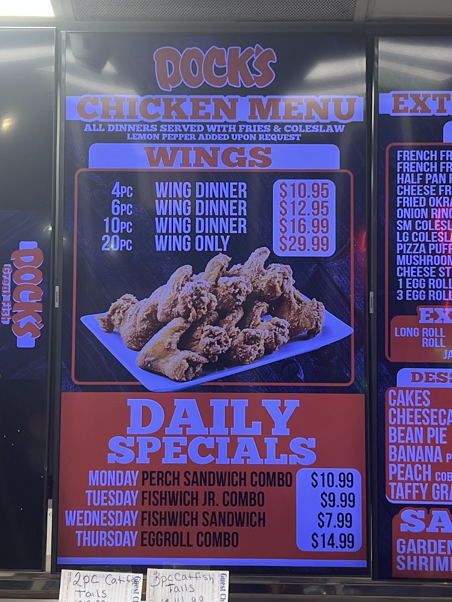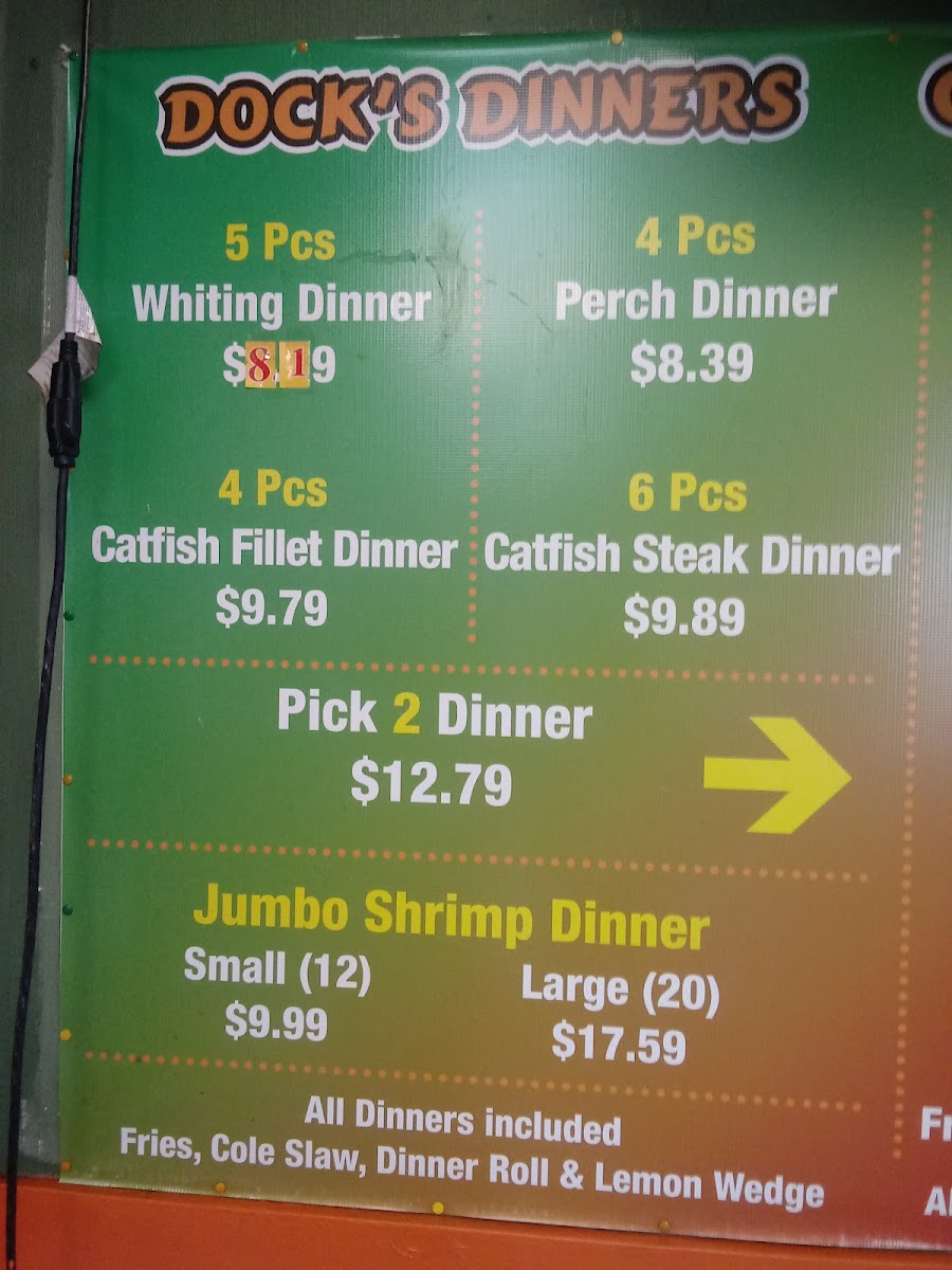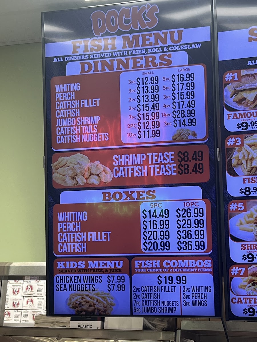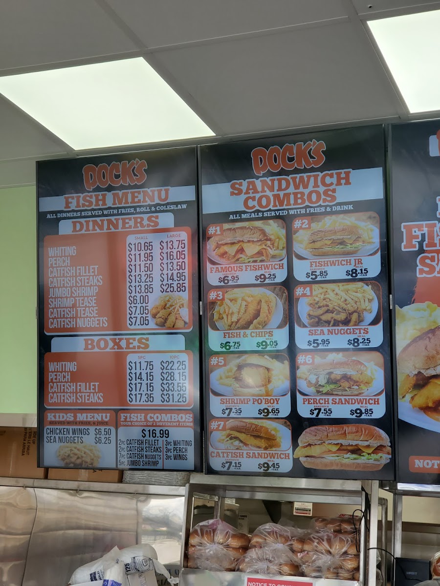 - Docks Boxes: These are combination meals featuring different types of fried fish such as whiting, perch, and catfish fillets. Each box includes rolls and lemon wedges, available in portions of 5 or 10 pieces.