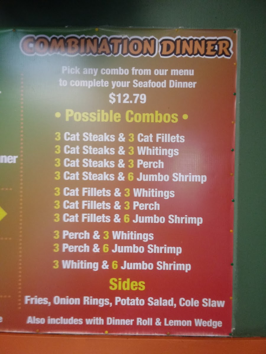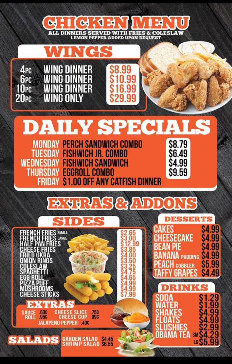 - Additional offerings include fried chicken wings served with fries and catfish dinners, reflecting typical American fast food staples centered on seafood and poultry.