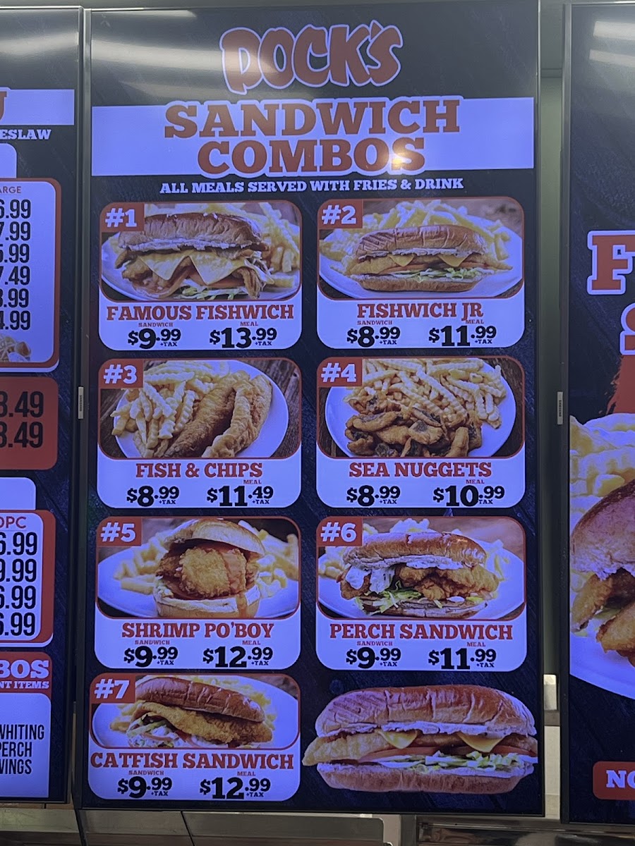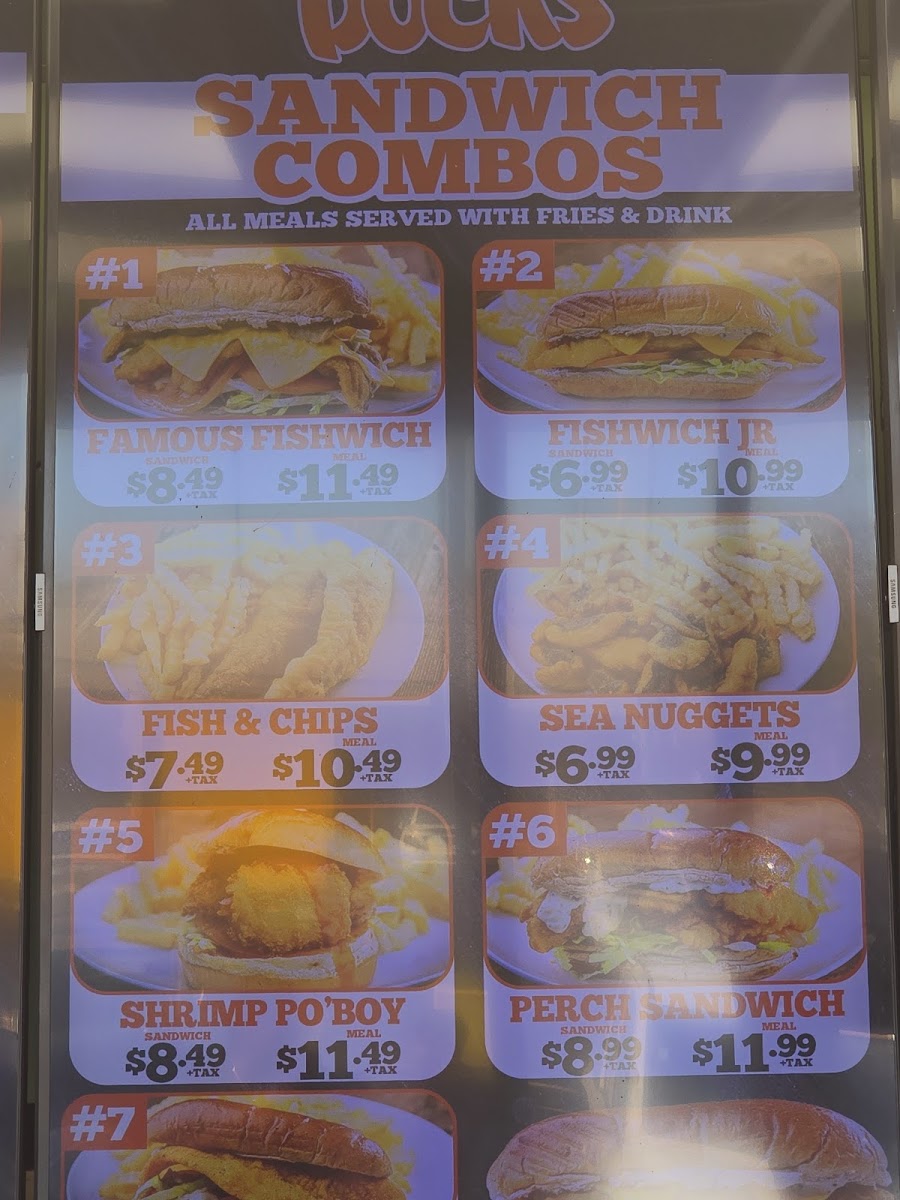 - Sandwiches: This section offers a variety of fish and seafood sandwiches, including the Fishwich, Shrimp Po'boy, Perch, and Filet sandwiches. Each sandwich is served with standard toppings like lettuce, tomato, and tartar sauce or special sauce for the Po'boy.